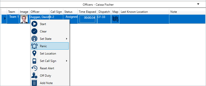 - In Officer Panel, the officer will also be outlined in red, and status set to Panic.