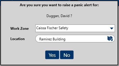 - Enter the Panic Alert’s Work Zone and Location (e.g., Corporate HQ - London) and click Confirm now.