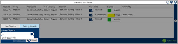- To add alarm details to an existing active dispatch, click the Existing Dispatch tab, enter the associated dispatch number, then click Escalate.