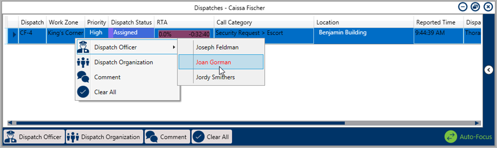 to search for an officer or right-click the task, hover your cursor over Dispatch Officer, then click the officer’s name to assign that officer.