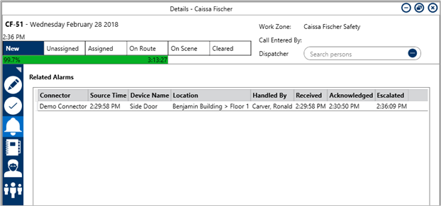 If Connect is configured to send alarms to Dispatch to be handled by a dispatcher, it’ll appear in the Dispatches panel, where additional actions can be performed.
