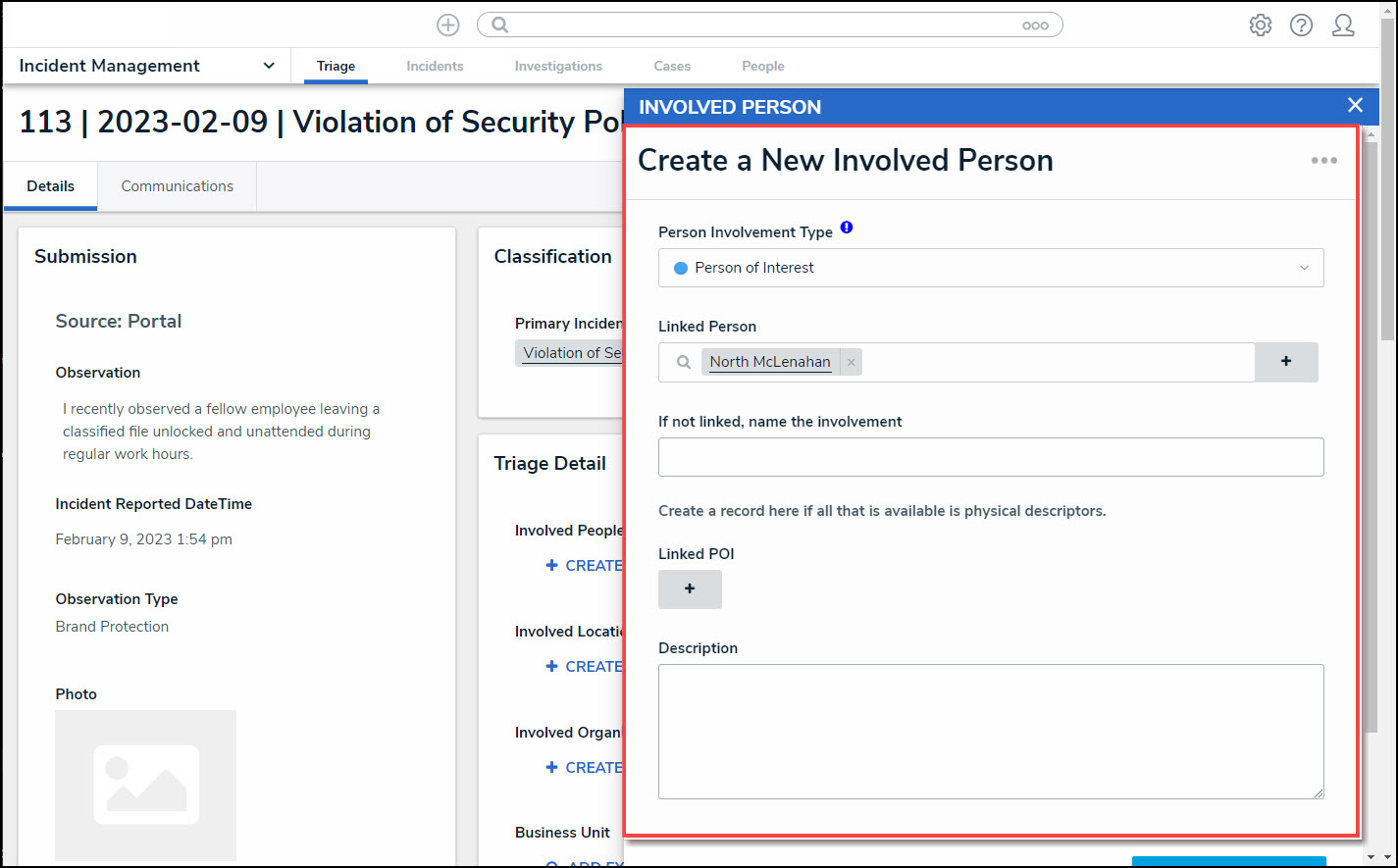 - Click the Create button to add the person of interest to the Incident.