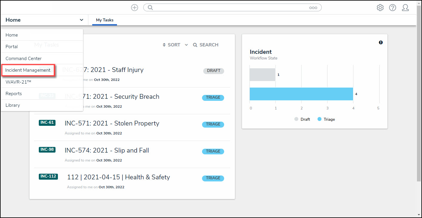 - From the Resolver Home screen, click the Home dropdown and select the Incident Management link.