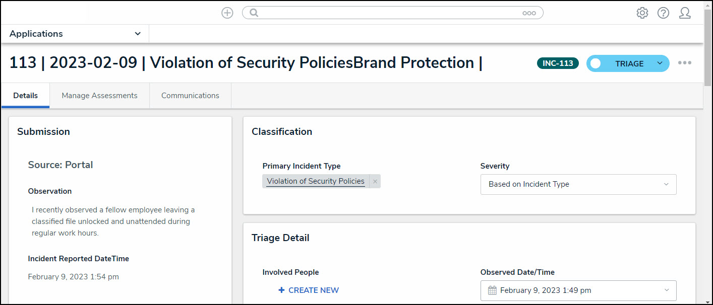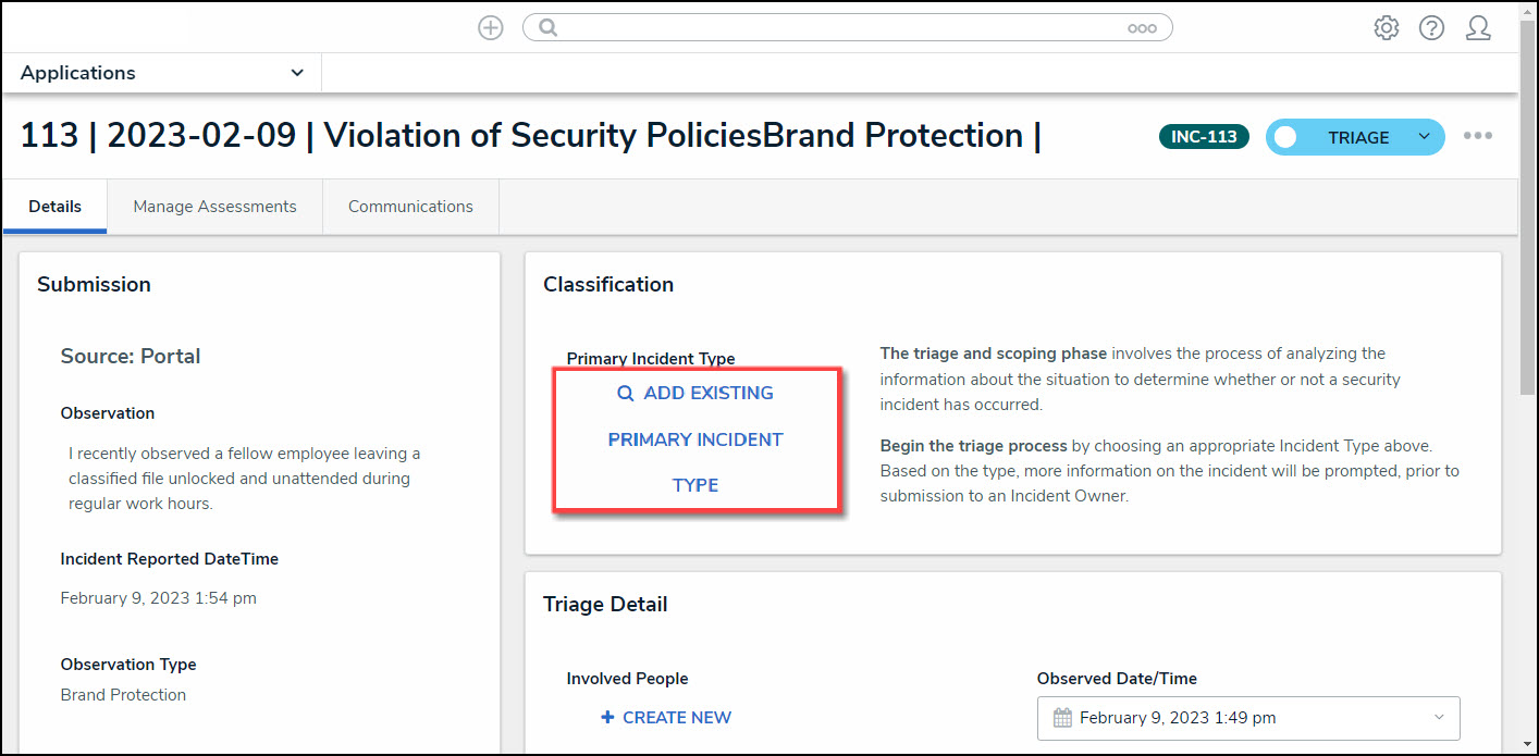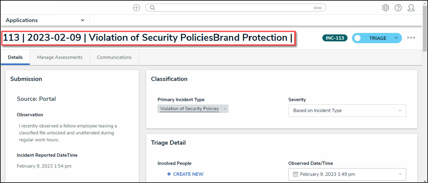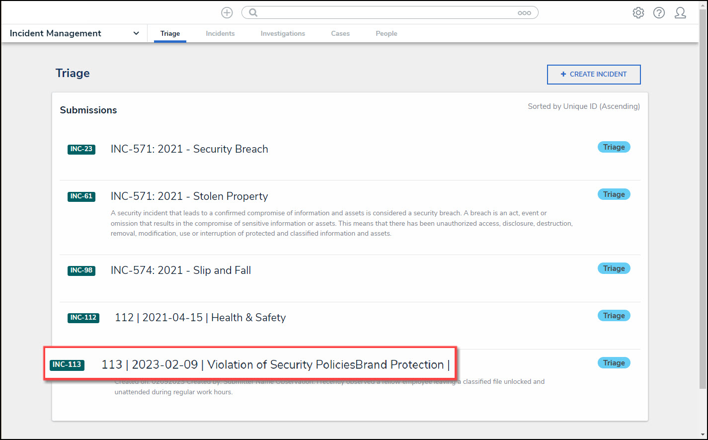 - From the Triage screen, click an Incident Name from the Submissions section.