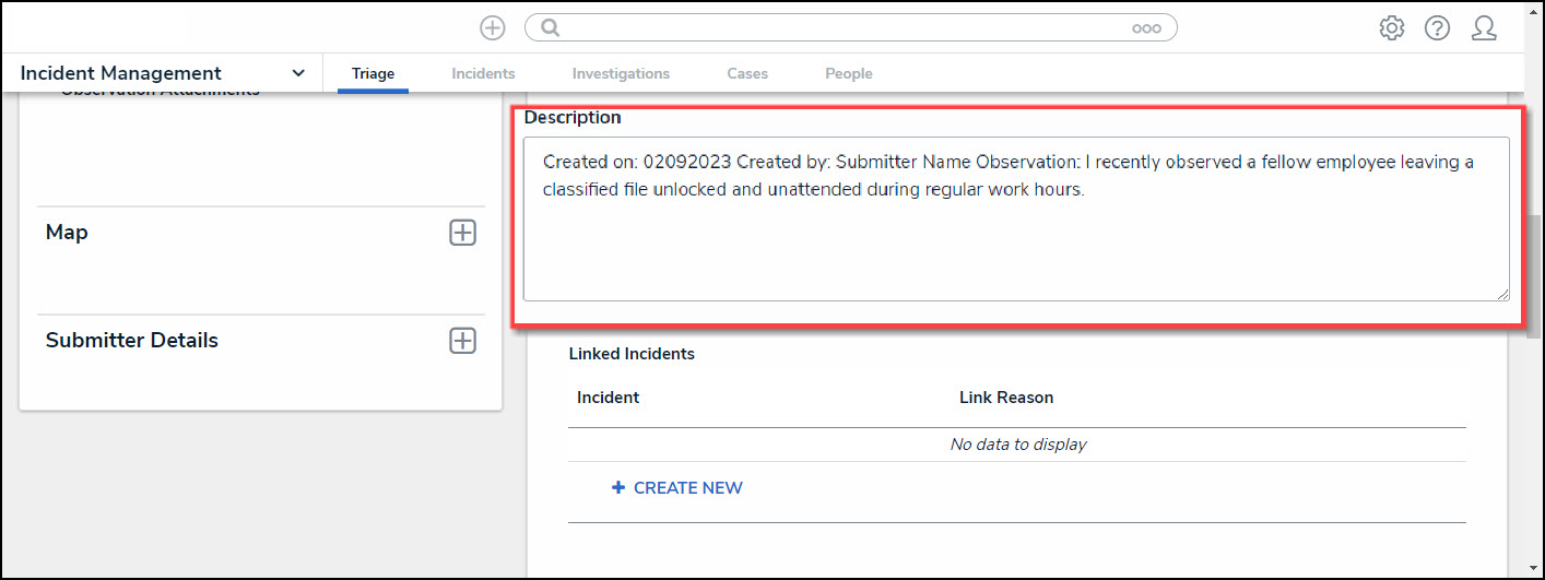 - (Optional) Click the Description text box to edit the Incident description. The system will automatically fill out the Description text box with the Create on - date, Created by - Submitter Name (if not Confidential), and Observation information.