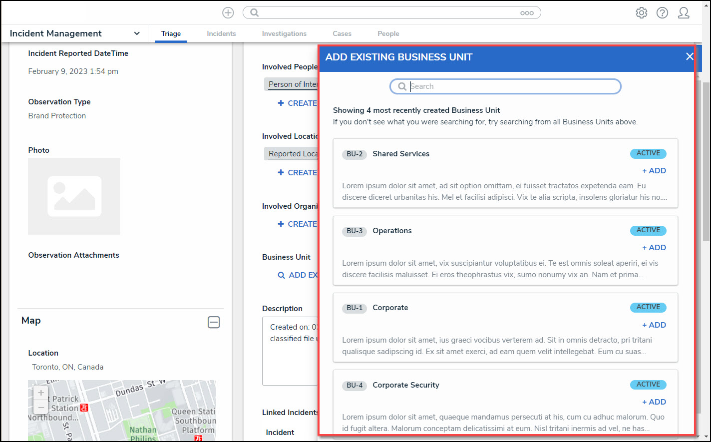 - Click the + Create New link to add a new Business Unit to the Incident details.