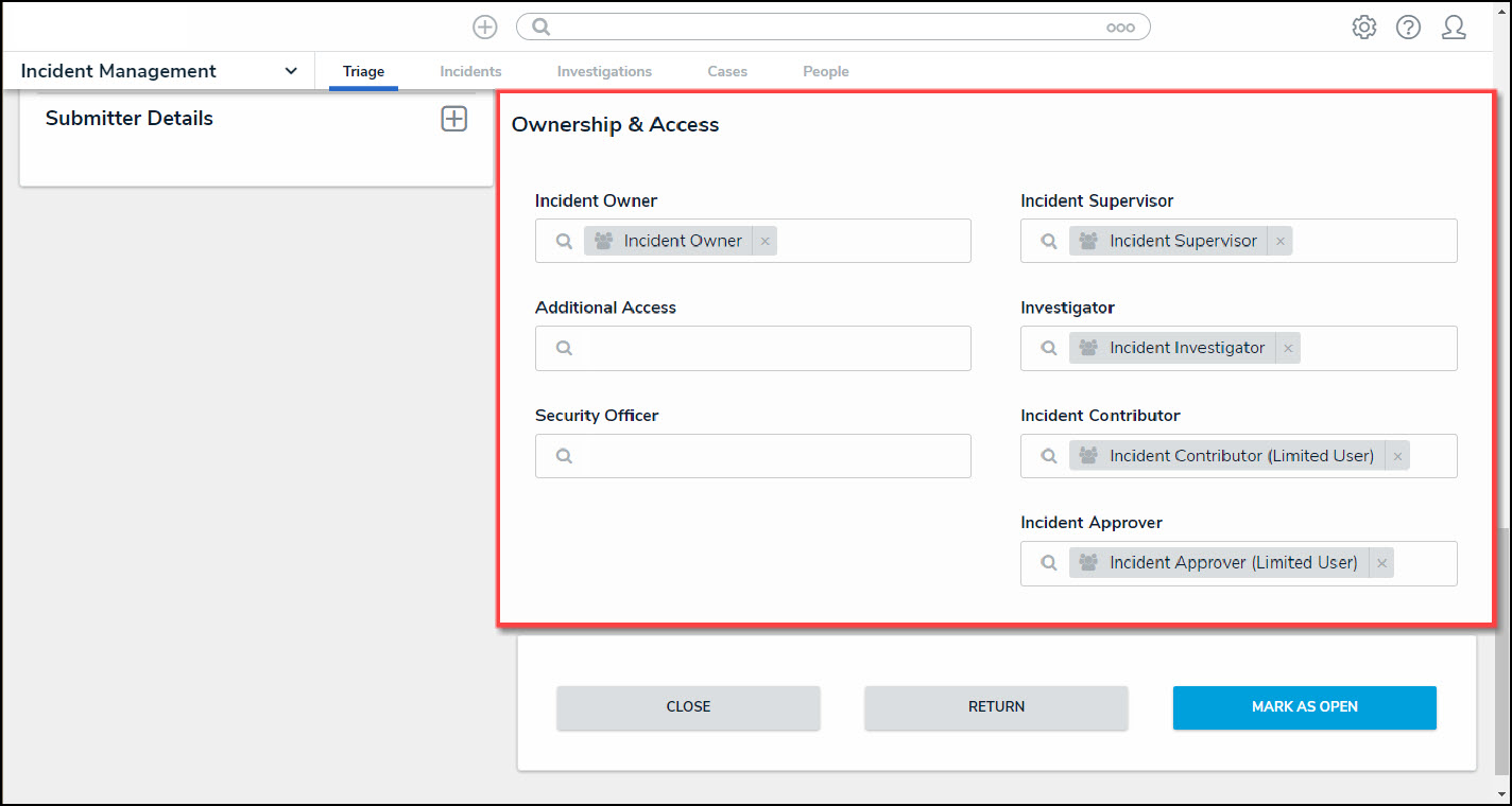 - Mark As Open: The Mark As Open button sends the incident to the Users or User Group in the Incident Owner field if further action is required.