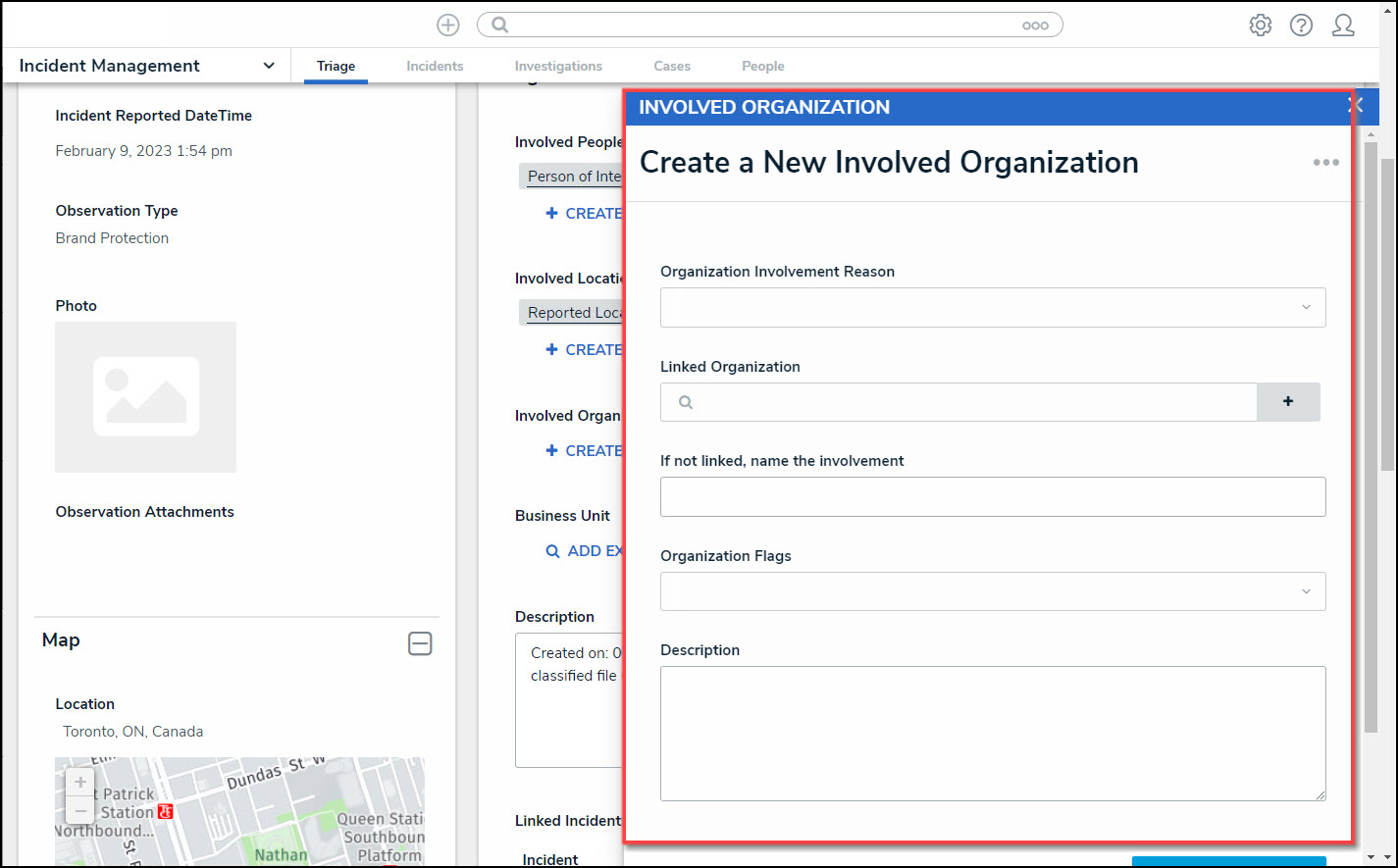 - Click the + Create New link to add a new Involved Organization to the Incident details.