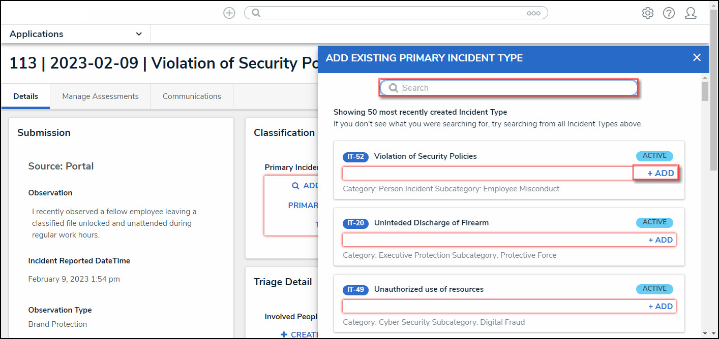 - From the Add Existing Primary Incident Type pop-up, select an Incident Type from the 50 most recently created Incident Type list by clicking the +Add link or enter an Incident Type Name in the Search field to search for an Incident Type that is not listed.
