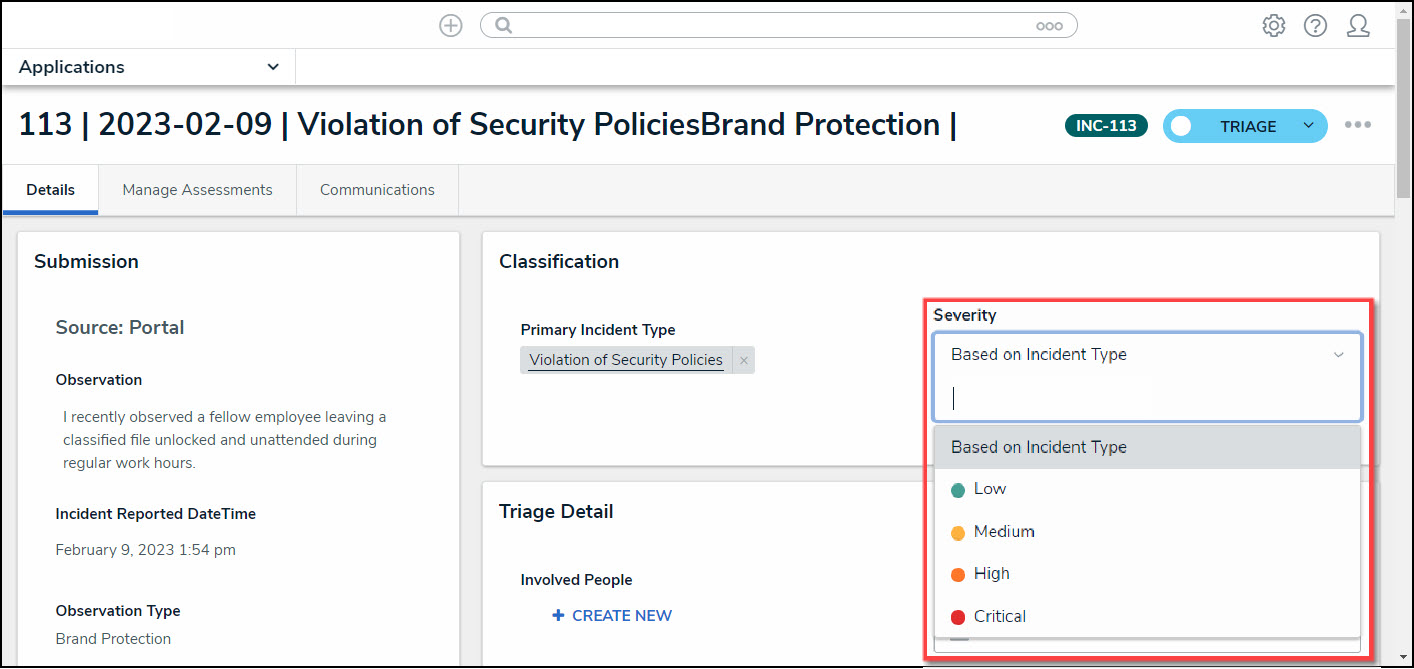 - (Optional) Edit the Incident's severity score by selecting a severity type from the Severity dropdown menu.