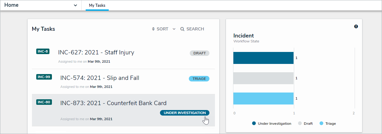 An incident under investigation in the My Tasks page.