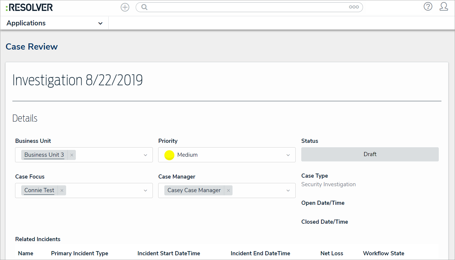 Optional: Click the search bar below Related Incidents. Begin typing the name of a related incident, then click to add the incident to the case.