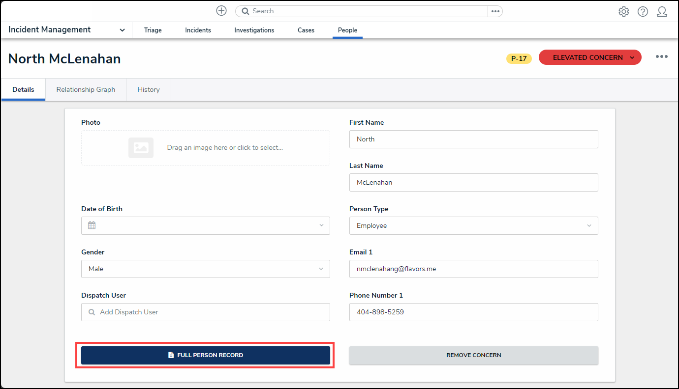 - (Optional) From the Full Person Record screen, scroll to the Related Data tab. On the Related Data tab, you can view the connected People & Organizations, Incidents, and Actives sections.