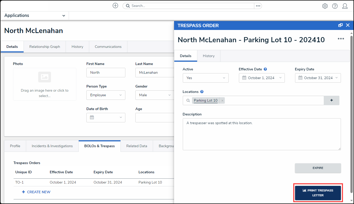 - From the Trespass Order pop-up, click the Print Trespass Letter button.