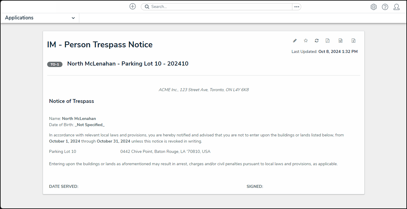 A generic template for a Trespass Notice letter is available from a Person's Trespass Order record. This letter can be generated as a PDF for direct printing or sending electronically.
