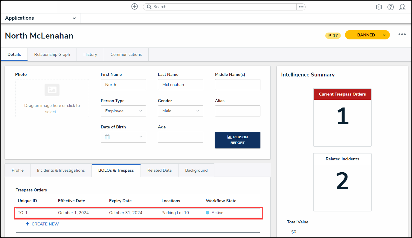 - From the BOLOs & Trespass tab, click on a Trespass Order.