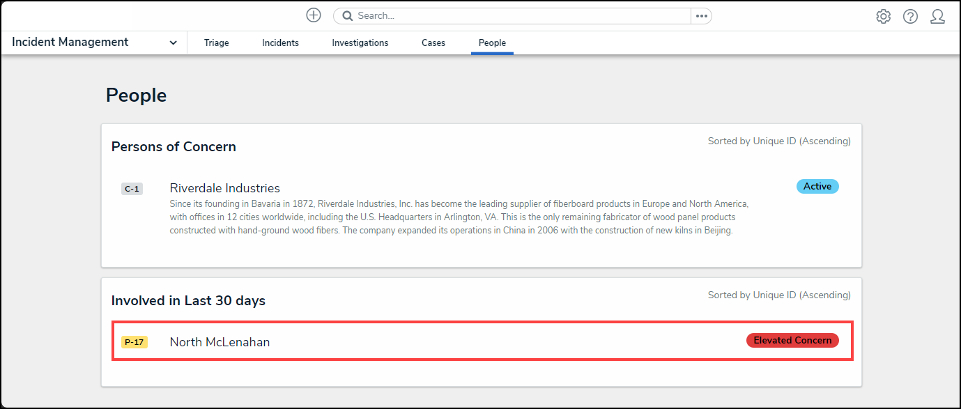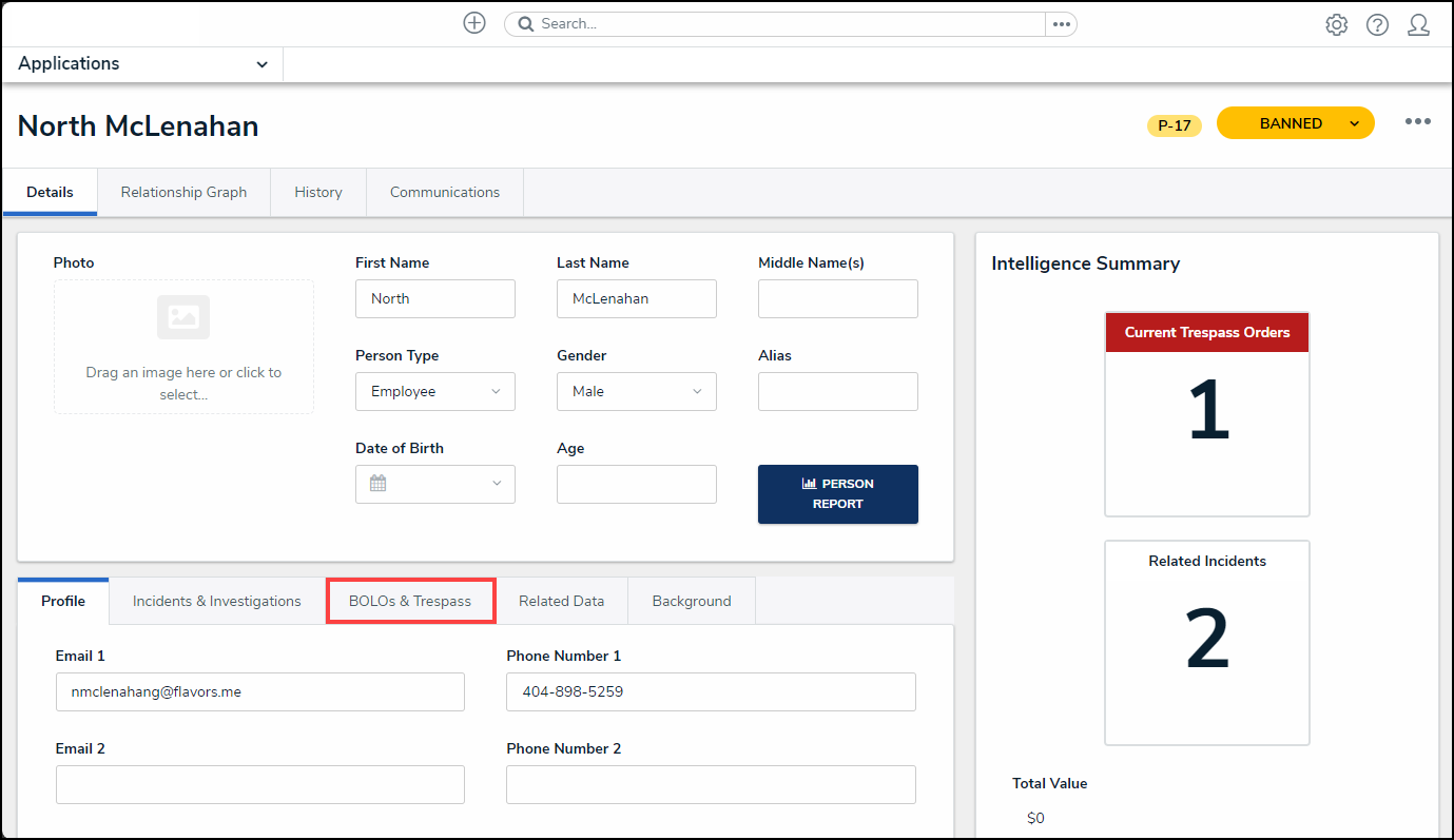 - From the People screen, click a person record in the Banned from Properties or Involved in Last 30 Days sections.
