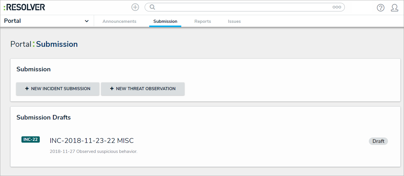 If you click the Save as Draft button when submitting an incident, you can view and edit your draft in the Submission Drafts section before submitting. Any incidents that are sent back to you for review by the Incident Screener will also appear in Submission Drafts. You will receive an email notification if an incident is sent back to you for review.