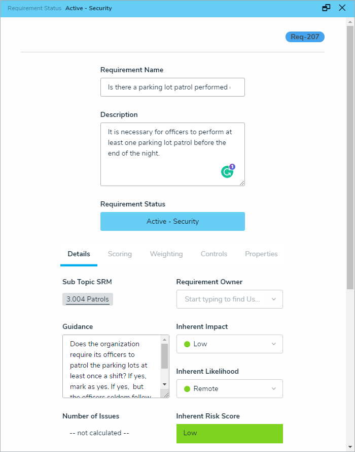 Requirements represent both the legal requirements and professional standards that the organization is expected to adhere to successfully mitigate security risks. For example, a sub section about patrols might contain requirements about the specific types of patrols officers should make before the end of each shift. Requirements can be attached to either sections or sub-sections. Once a requirement has been added to the section or sub-section, it can be updated at any time.