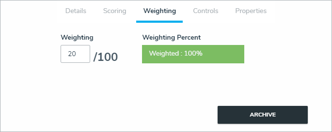 In the Weighting tab, adjust the value in the Weighting field to reflect the percentage of the total section or sub-section this requirement should take up. All requirements in each section or sub-section should equal 100%.