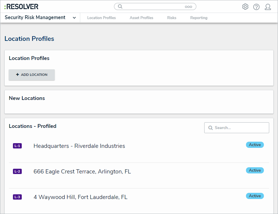 - Click the dropdown in the nav bar > Security Risk Management. The Location Profiles tab will display by default.