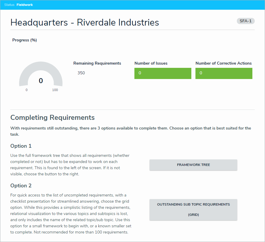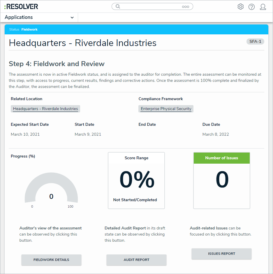 Once an assessment has been launched, members of the Security Audit Fieldwork user group can then access it and either complete each of its requirements or attach issues and corrective actions. Once the fieldwork has been finalized, it will then be sent to the Review workflow state to be closed by a member of the Security Assessment Team user group. If it was set to be recurring, it will be reassigned to the same auditor in the Fieldwork phase at the date set in its Expected Start Date field next year.