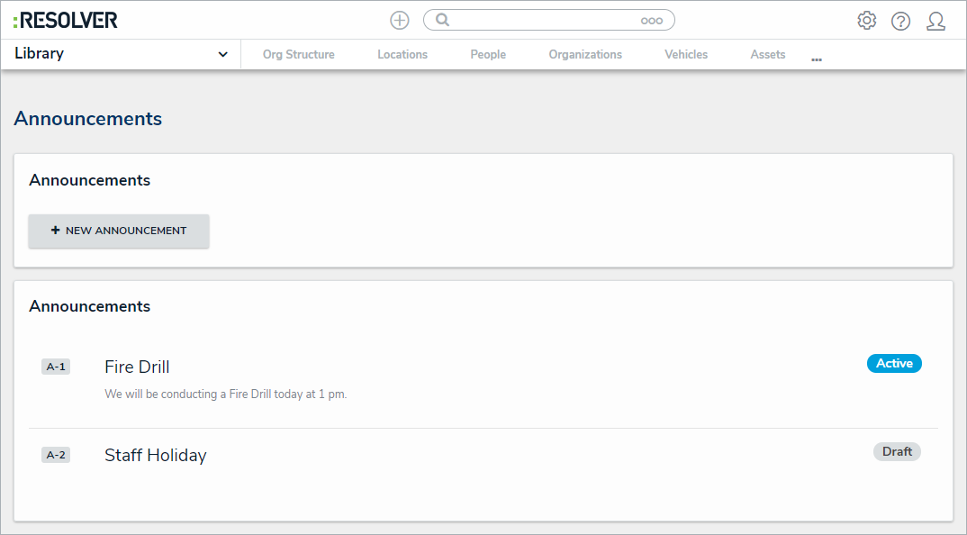 Announcements can only be created by an administrator in the Library application. You can add pictures, attachments, and links to an announcement, or send an email notification. Active announcements are visible in the Portal application.