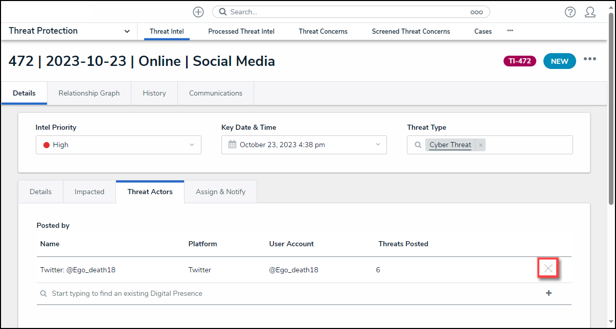 - Click the Delete (x) icon to remove the Digital Presence from the Threat.