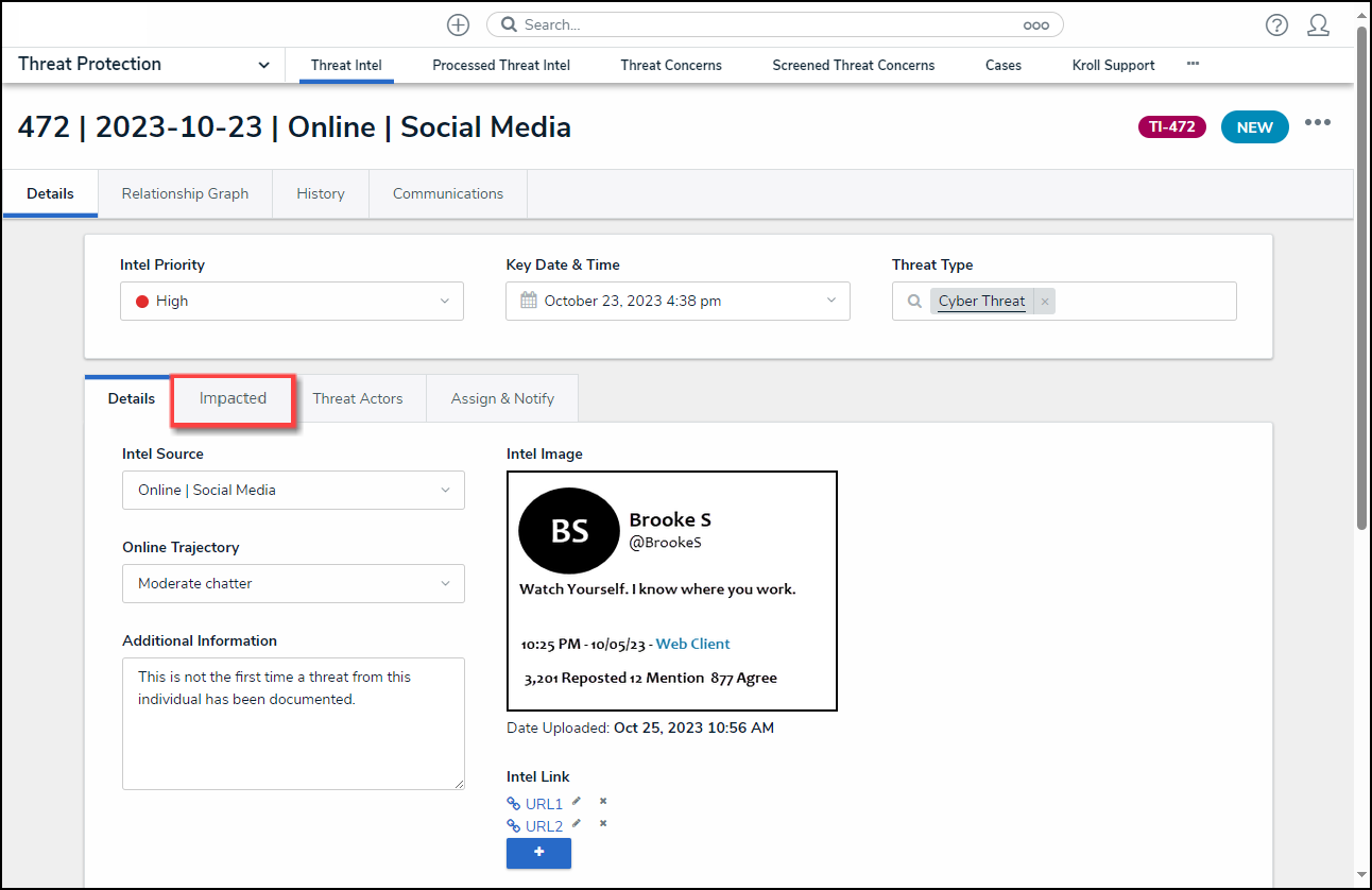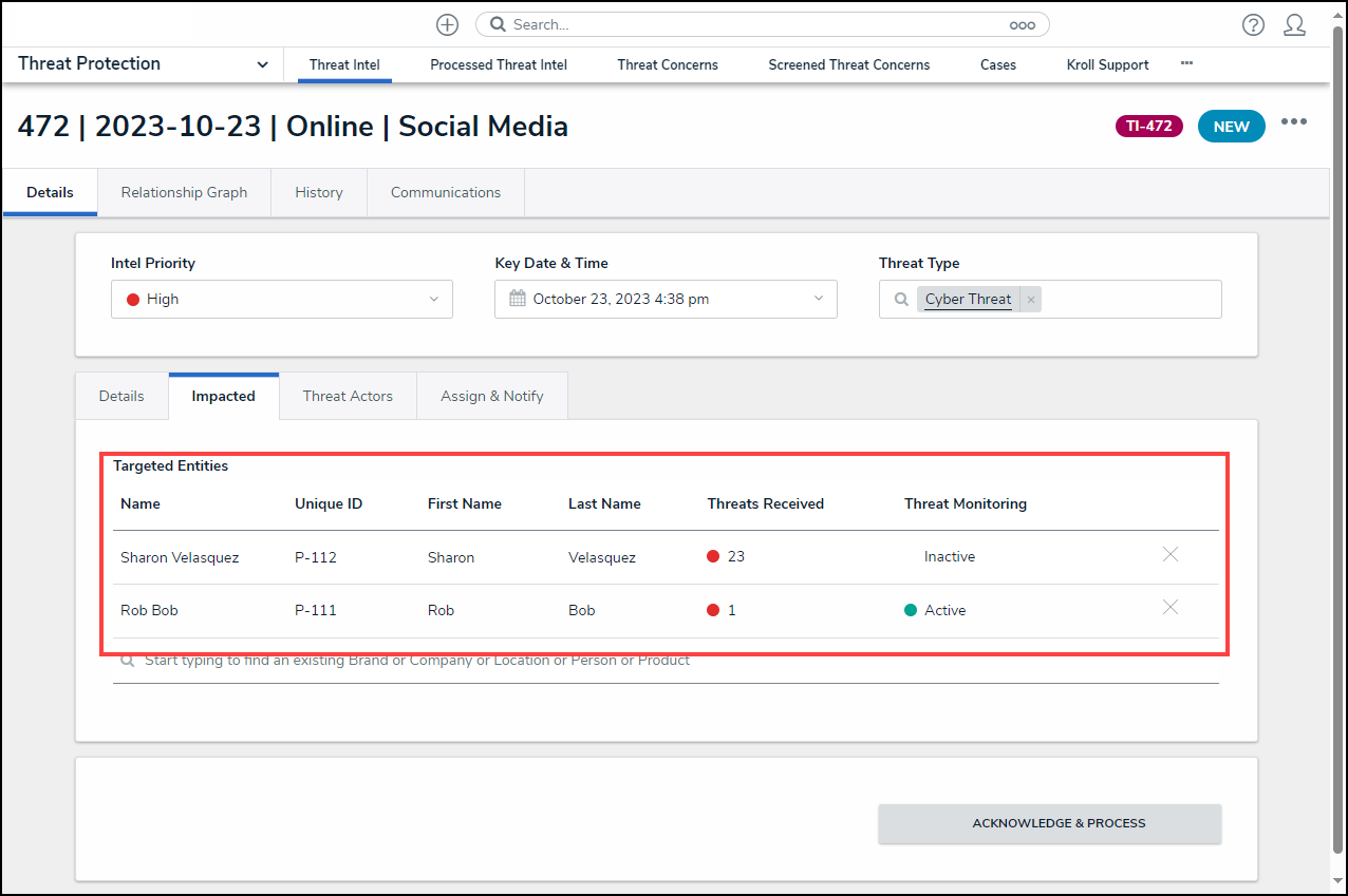 Users can add a Targeted Entity to a Threat to track an Individual, site, or asset that has been threatened. Targeted Entities can be added when creating a new Threat Intel when triaging a threat or for Threat integrated into Resolver from a third-party online monitoring tool (e.g., LifeRaft®, samdesk®, etc.).