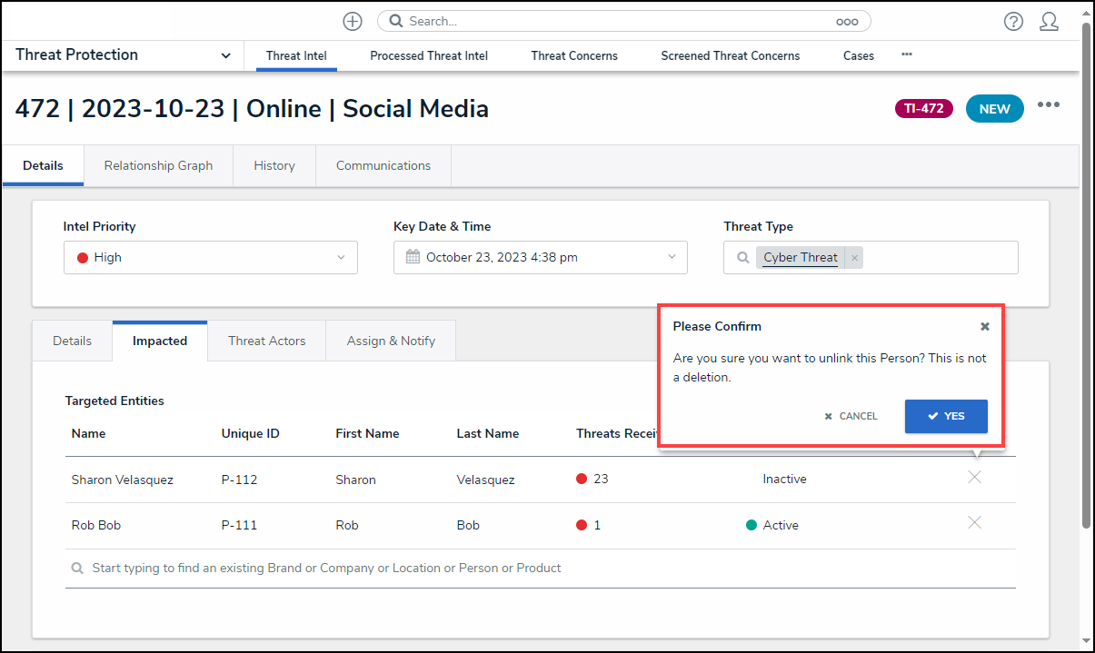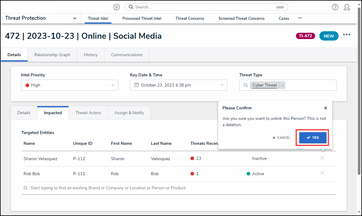 - Click the Yes button to remove the Digital Presence from the Threat.