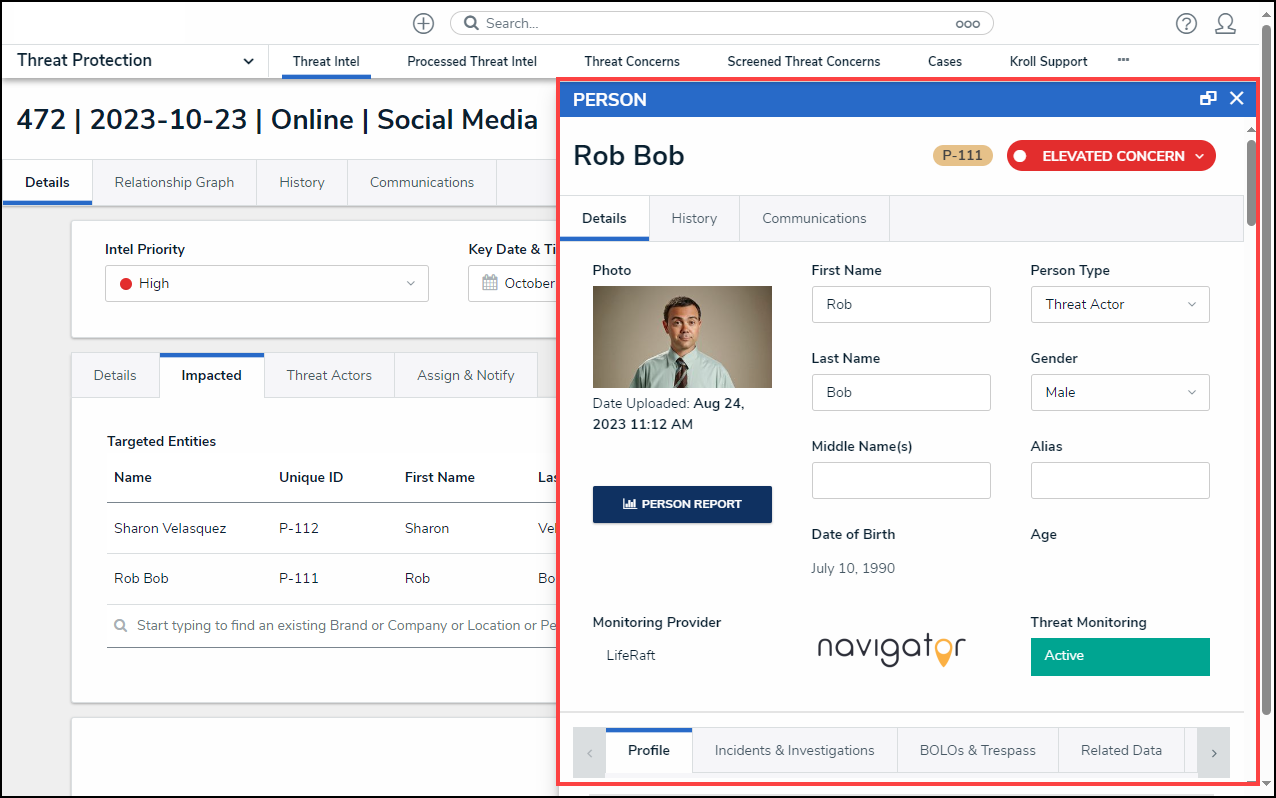 - Click anywhere in the Targeted Entities table to open the Person pop-up to view Profile Details, run the Person Report, or mark a Targeted Entity as an Elevated Concern.