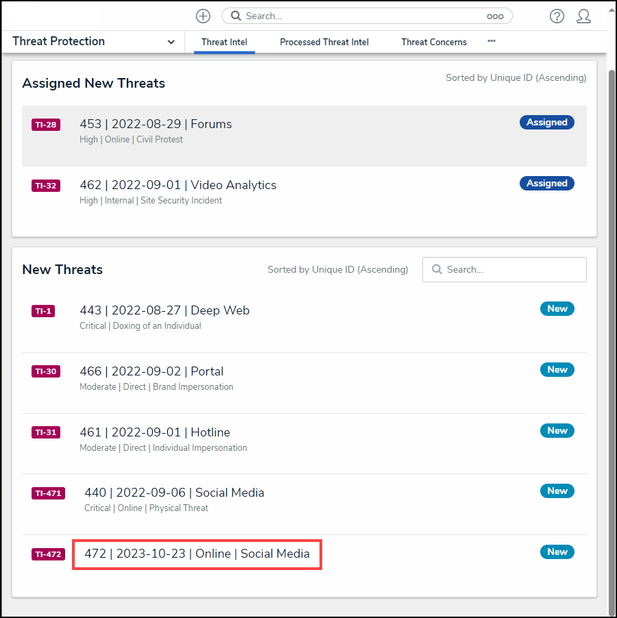 - From the Threat Intel screen, click a Threat Intel link from under the New Threats section.