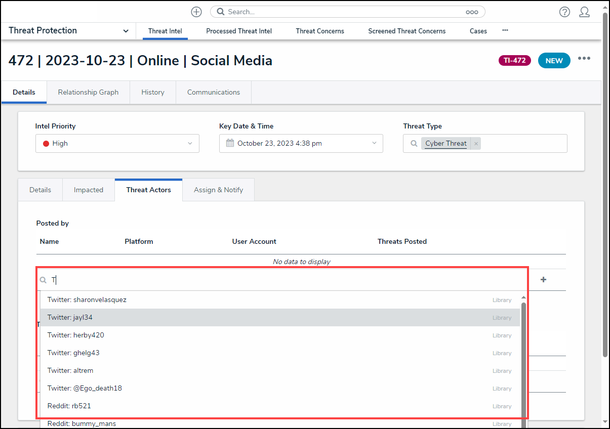 - From the Threat Actors tab, click the Search field under the Posted by table and enter a Threat Actor's digital presence. A Threat Actor's Digital Presence is a user ID associated with a social platform to post opinions online.