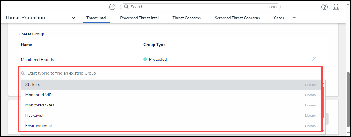 - Select a Threat Group from the Search dropdown menu. Multiple Threat Groups can be added to a Threat.