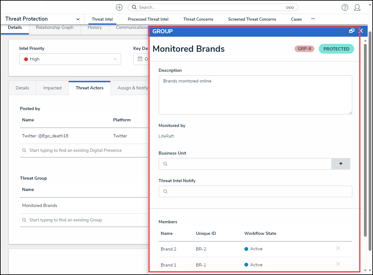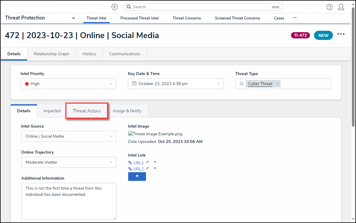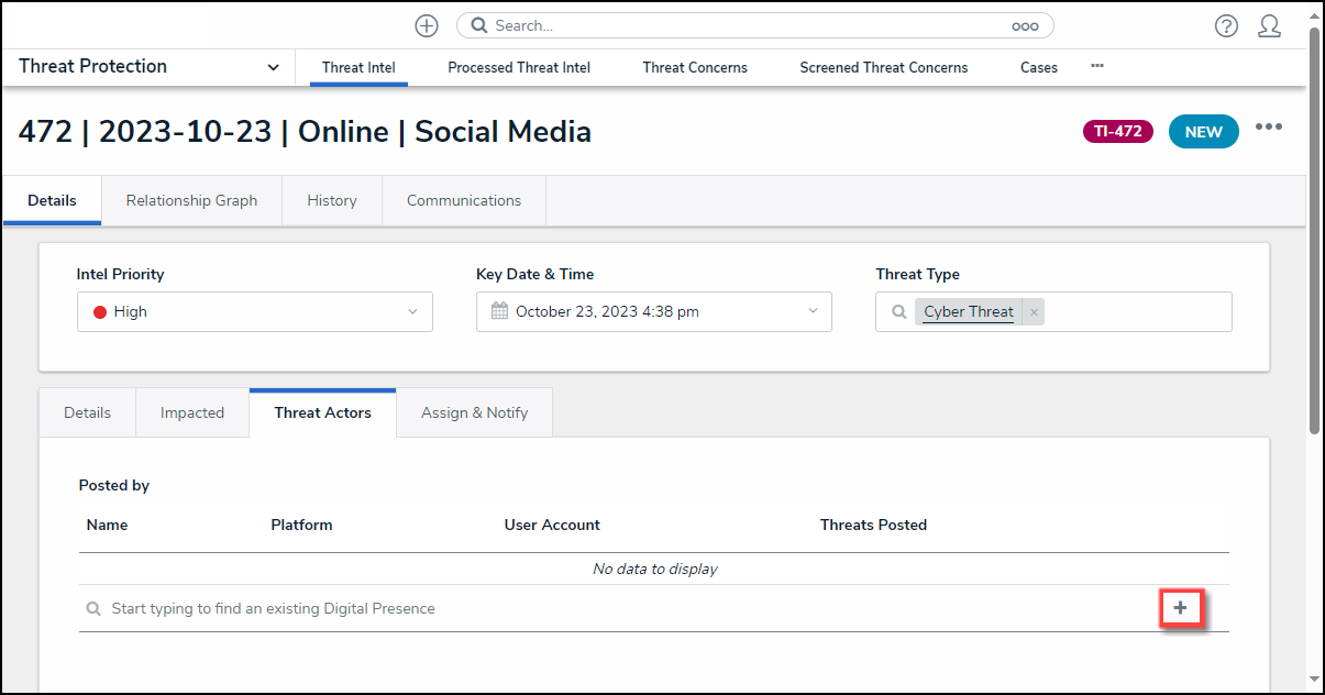 Users can add a Threat Actor to a Threat to track the Individual who caused harm through a cyber threat or harm to a system. Threat Actors can be added when creating a new Threat Intel when triaging a Threat or for Threat integrated into Resolver from a third-party online monitoring tool (e.g., LifeRaft®, samdesk®, etc.).