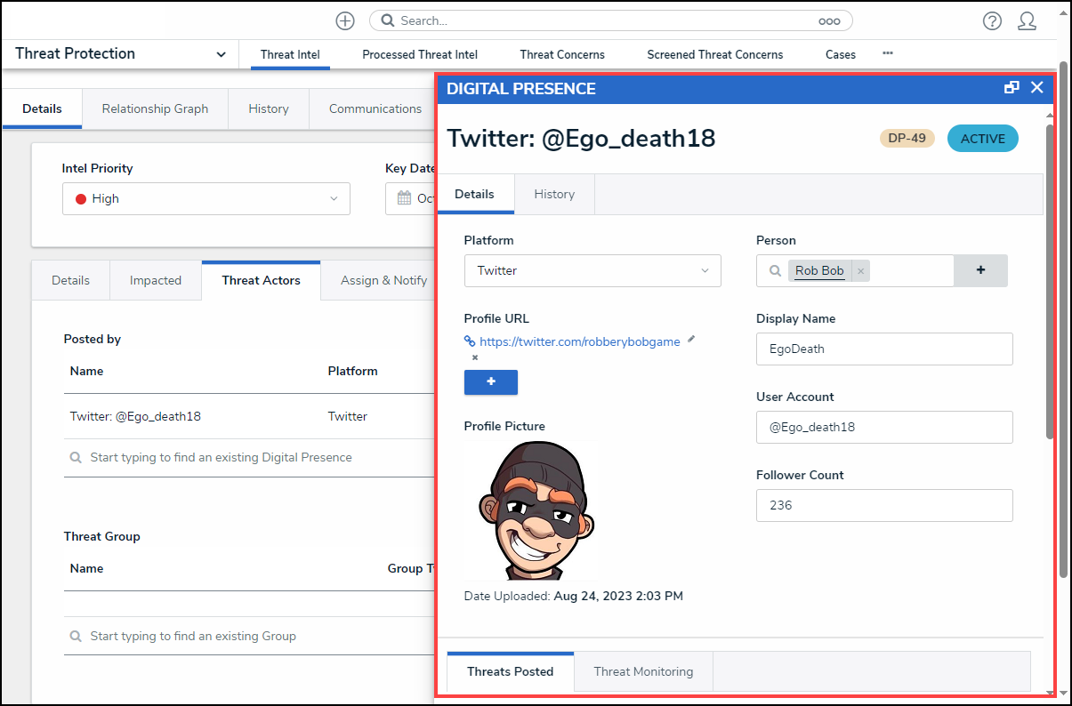 - The following Digital Presence information will be pulled into the Posted by table when you add a Digital Presence to a Threat: