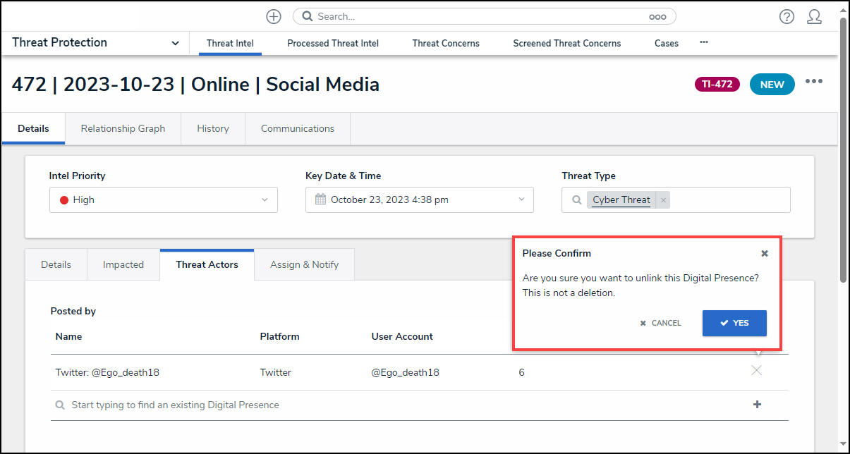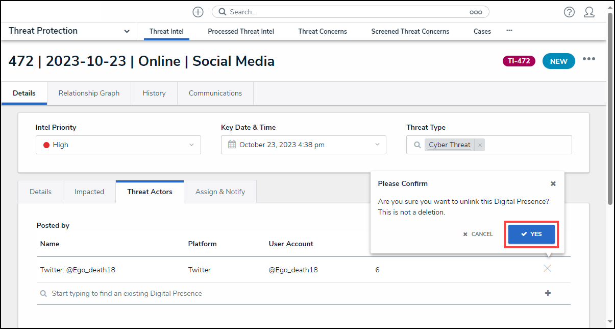 - Click the Yes button to remove the Digital Presence from the Threat.