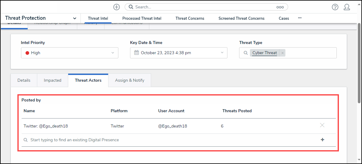 - Select a Digital Presence from the Search dropdown menu. Multiple Digital Presence can be added to a Threat.