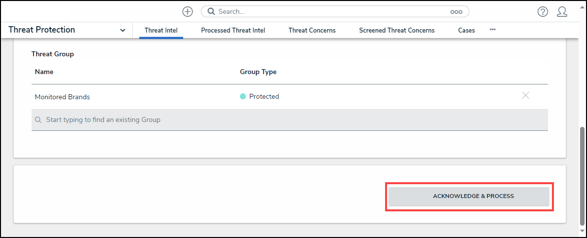 - After filling out the threat actor tab, you can choose to process and acknowledge the threat within the system by clicking the Acknowledge & Process button, or the user can assign the threat to another user if additional investigation needs to take place.