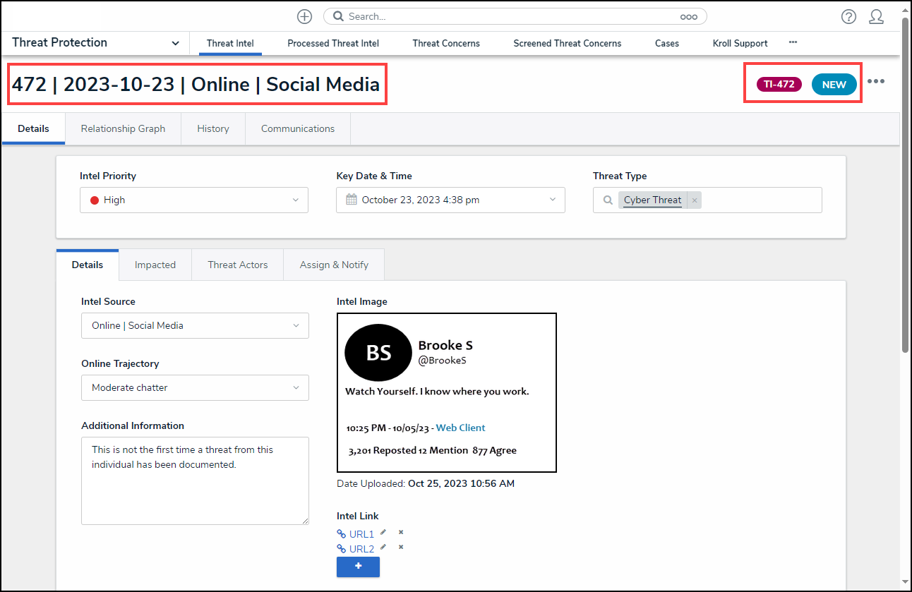 - The Threat Intel Details screen will appear, listing the newly created Threat Intel. The ID Number, Creation Date, and Intel Source will appear on the top left-hand side of the screen, and the Threat Intel ID and Status will appear on the top right-hand side.