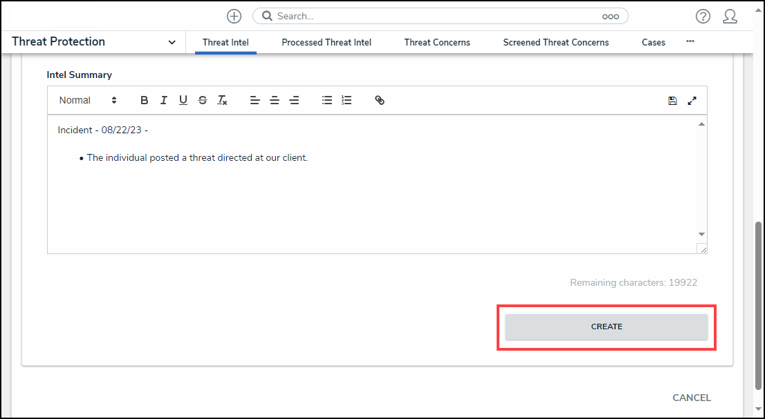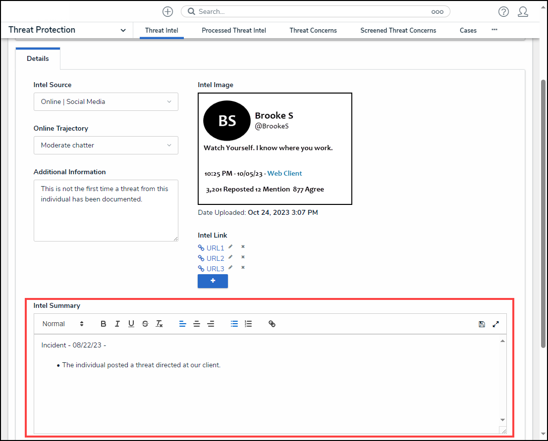 - Enter a Threat summary in the Intel Summary field. You can apply simple formatting to the text entered in the Intel Summary field.