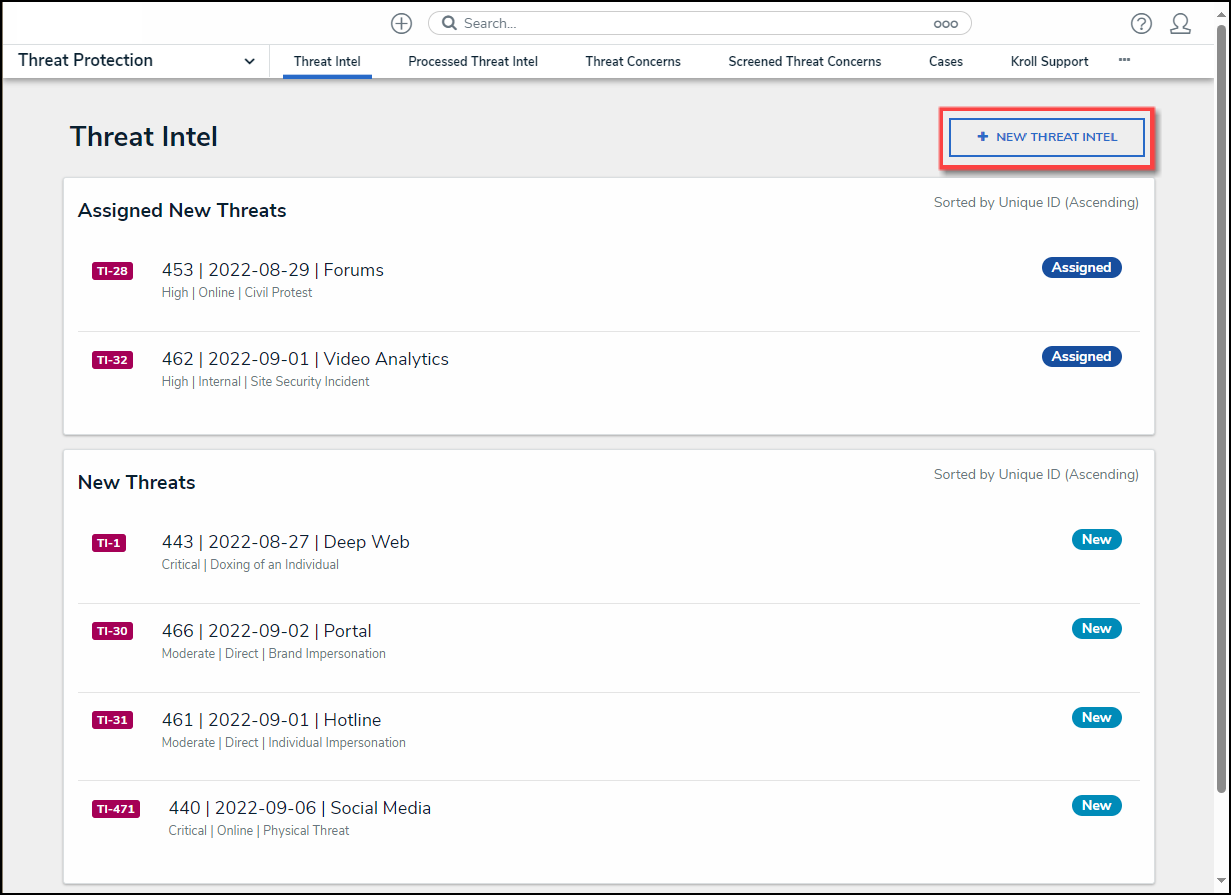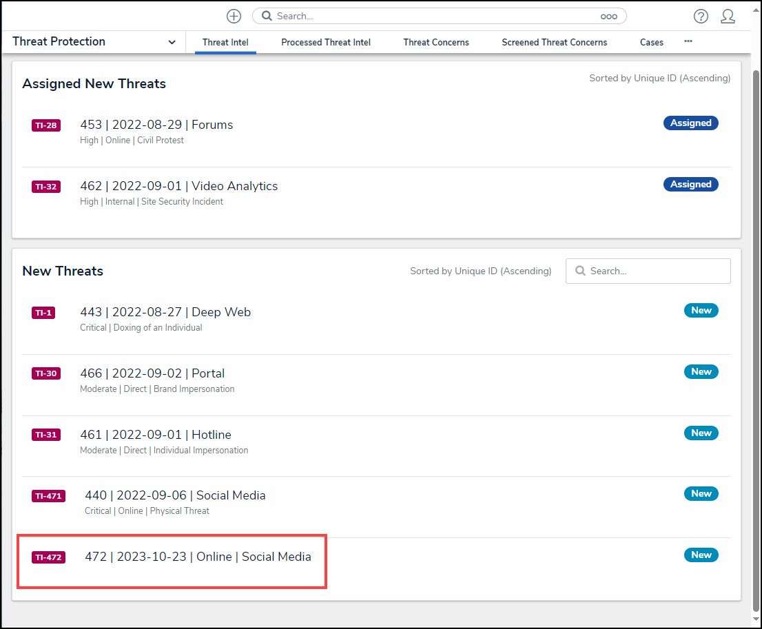 - The Threat Intel will appear on the Threat Intel screen under the New Threats section.