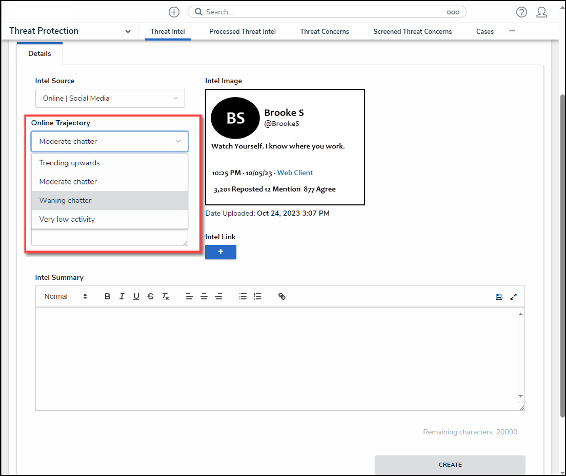 - Select an Online Trajectory option from the dropdown menu. The Online Trajectory indicates how the threat is currently trending in popularity online.