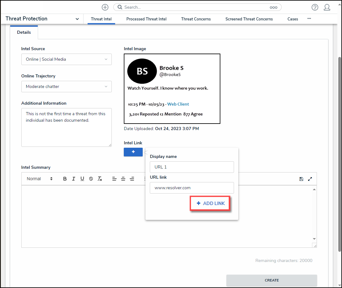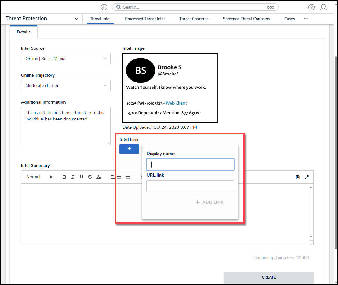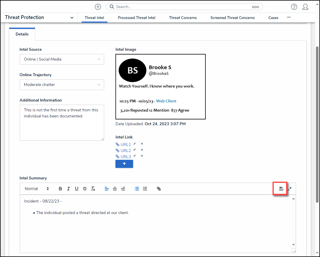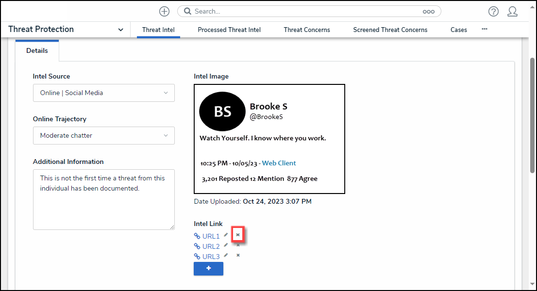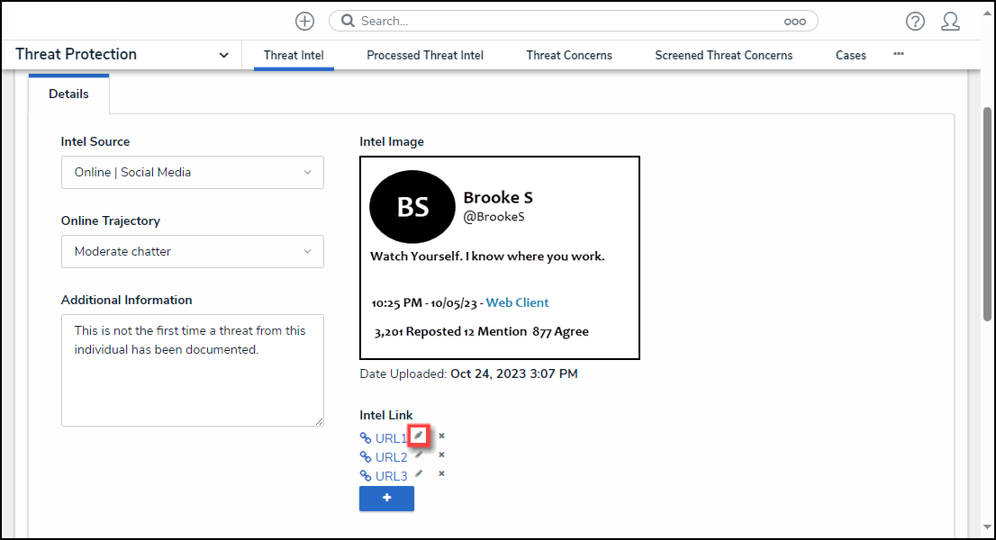 - Click the Intel Link icon to add URL references to the Threat Intel.