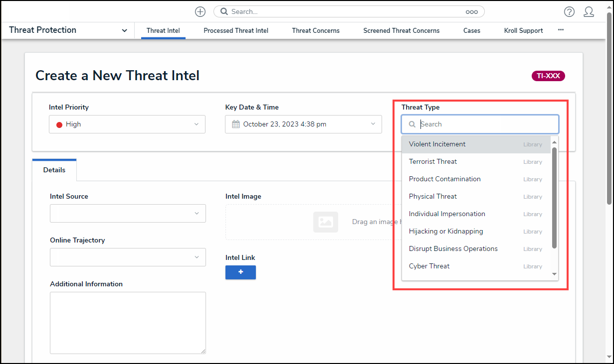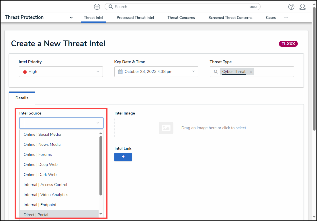 - From the Details tab, select an Intel Source from the dropdown menu. The Intel Source indicates where the threat originated (e.g., Online, Internal, etc.).