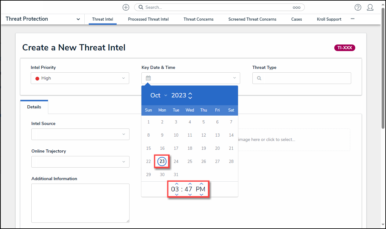 - Select the date & time the threat occurred by clicking the Key Date & Time dropdown and selecting the Date by clicking a day on the Calendar pop-up and a Time using the Increase and Decrease arrows.
