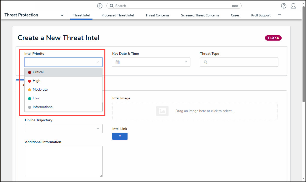 - From the Create a New Threat Intel screen, select an Intel Priority from the dropdown menu. The Intel Priority indicates the severity of the Threat Intel.