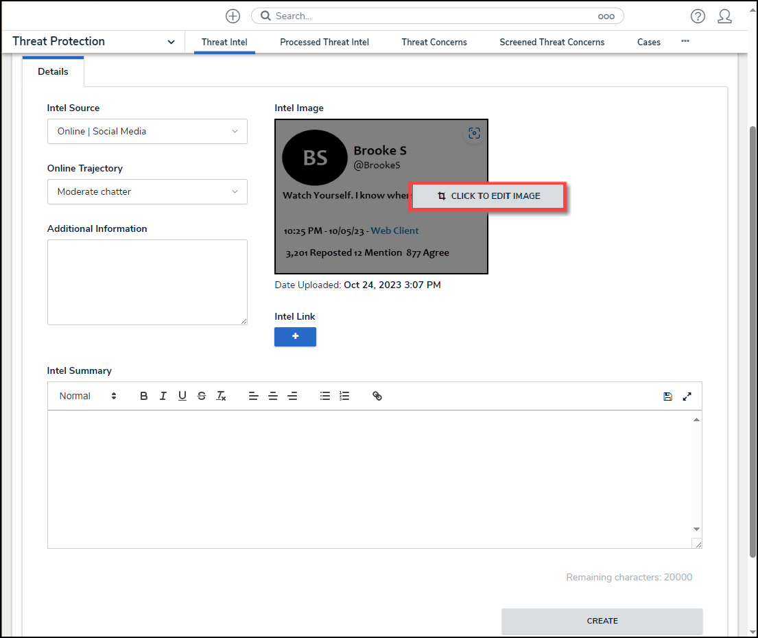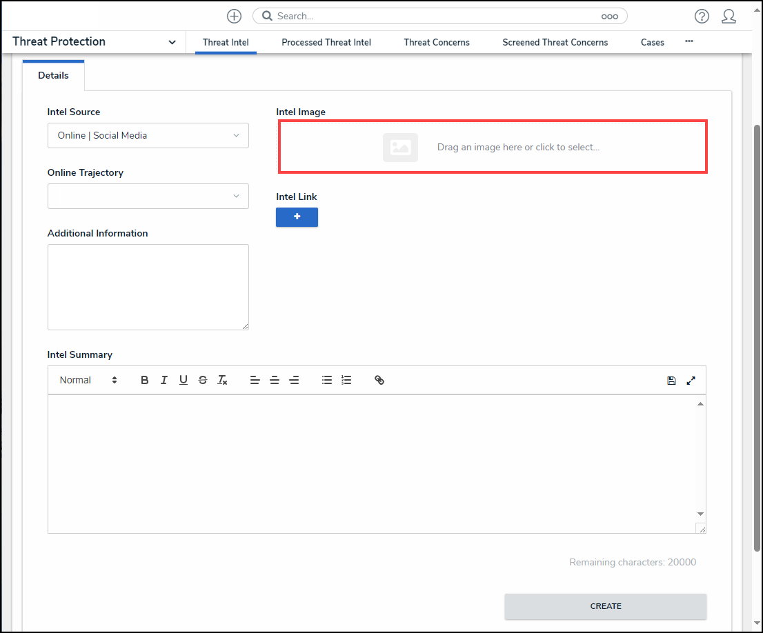 - Add image evidence to the Threat Intel by clicking the designated area within the Intel Image field and selecting an image file from the connected PC or drag and drop an image from the connected PC into the Intel Image field. Users can add an image file (.JPEG, .PNG, or .GIF) to the Image Intel field.