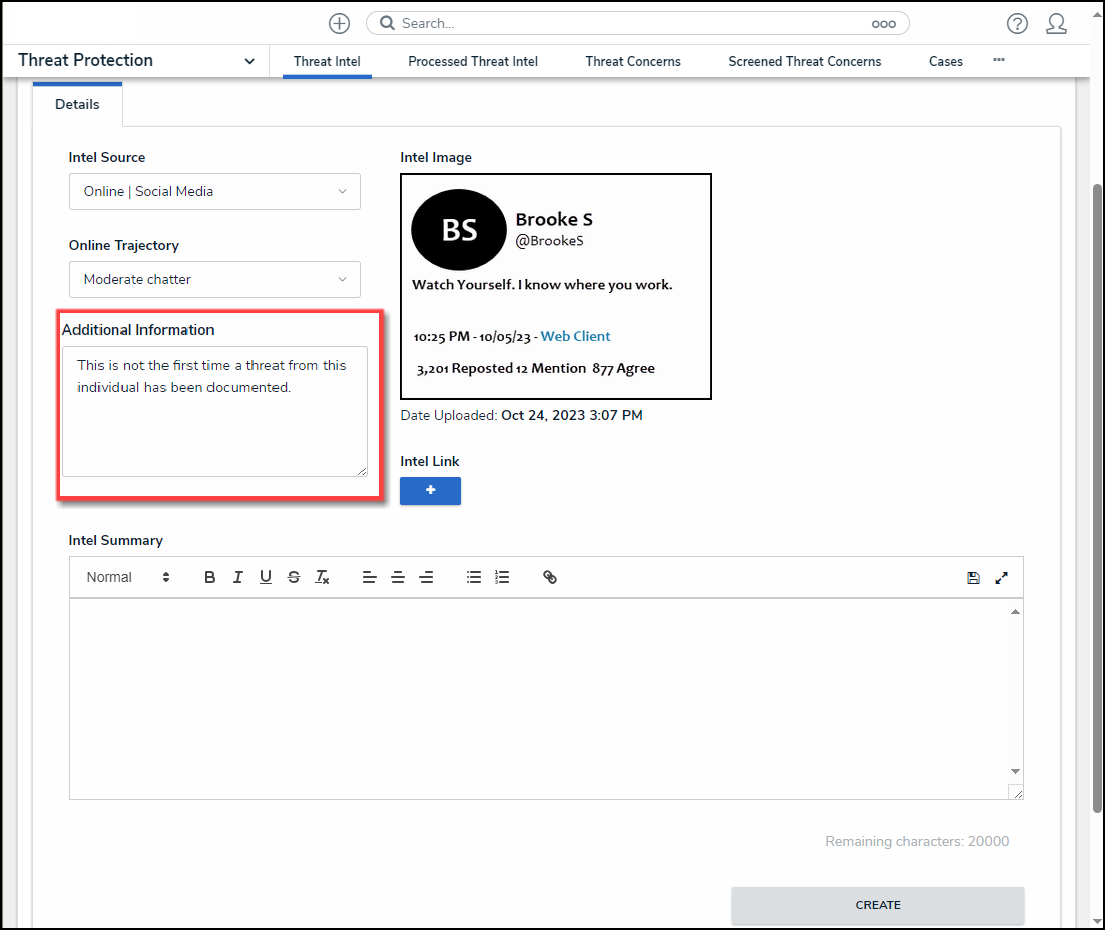 - Intel Summary information from third-party applications (e.g., LifeRaft®, samdesk®, etc.) will be pulled into the Intel Summary field through the integration source system and tagged accordingly (e.g., extracted text).